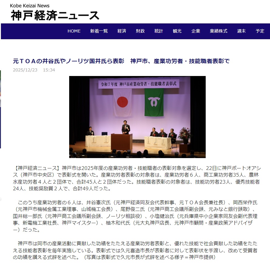 令和7年12月22日、当社代表取締役社長小塩健治が、神戸市様から神戸市産業功労者表彰を頂きました。