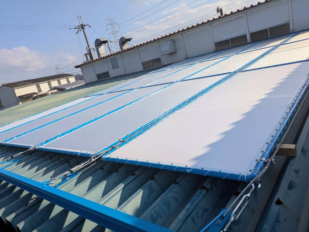 今後ますます激しくなる地球温暖化の対策のため、このたびバンドー化学株式会社様が開発された革新的省エネフィルム「Silver Arrow」の販売施工代理店契約をさせていただき、今まで暑さで困っておられたお客様工場屋根の遮熱対策を行いました。